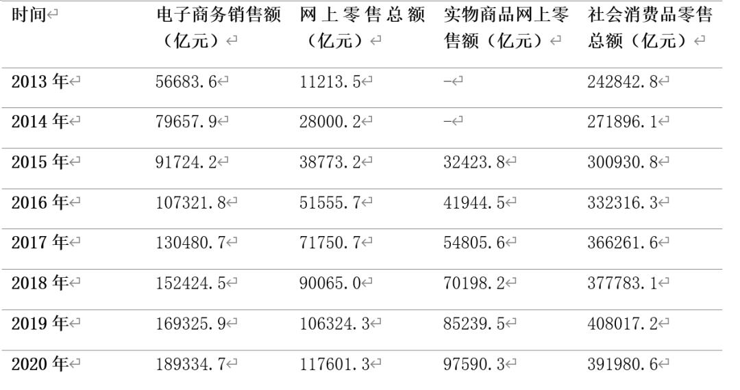 近年來我國互聯網產業呈現高速發展態勢,網民數量與互聯網普及率不斷增長,為網絡購物奠定了龐大的用戶基礎。數據顯示,截至2020年3月,我國網民規模達9.04億人,互聯網普及率為64.5%,較2018年底提升4.9個百分點。與此同時,電子商務市場規模也在不斷增長。2020年,電商領域總就業人數達到6015萬,較2019年增長約17.35%,預計到2025年將達到7000萬人。此外,2021年上半年,我國電商用戶達8.12 億,較2020年12月增長2965萬。2020年網上零售額為11.76萬億元,是2013年的10.5倍,占社會消費品零售額的比重由2013年的5%增長到2020年的30%?!?021年中國電商年度發展報告》顯示,今年前三季度我國網上零售額達9.19萬億元,同比增長18.5%。